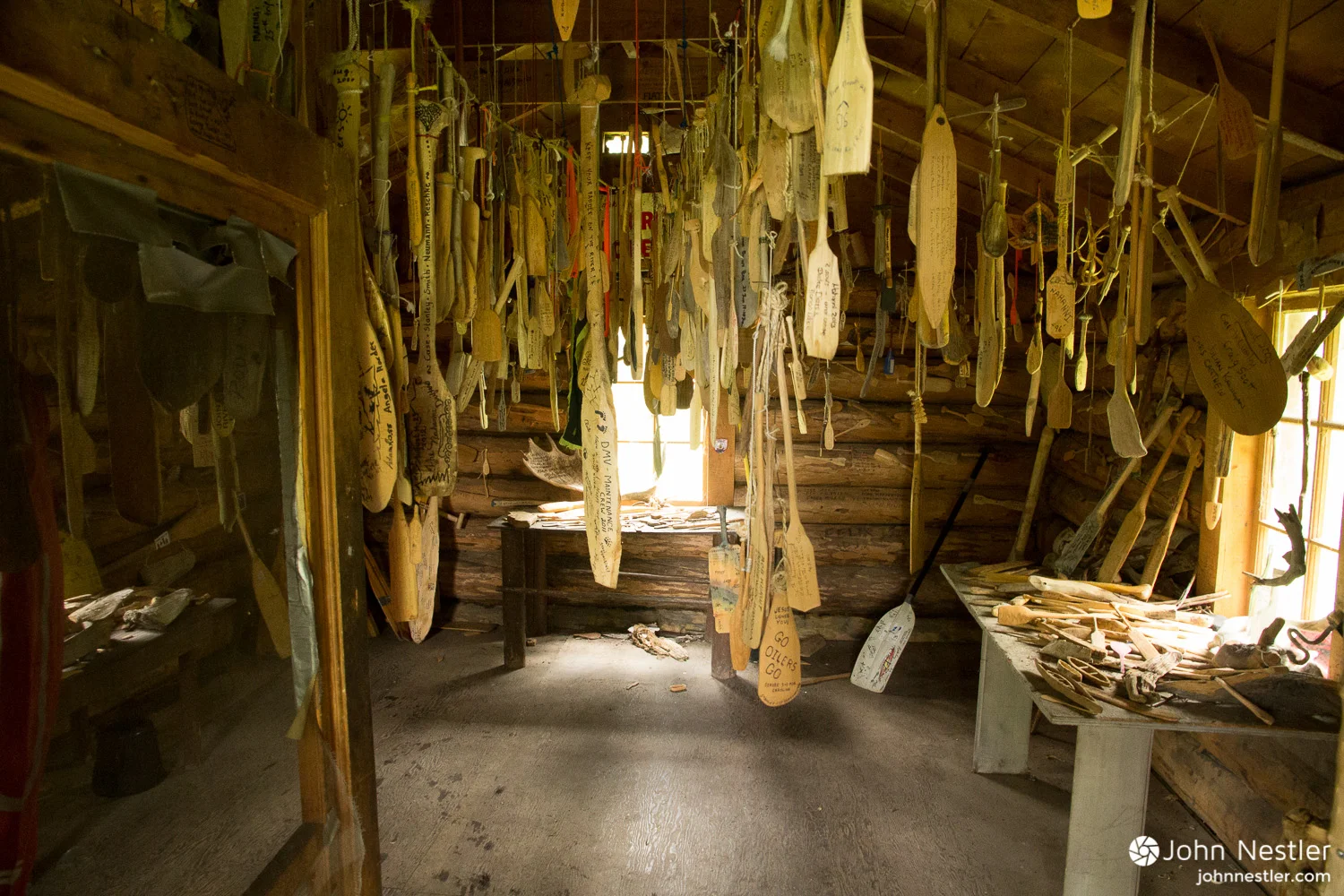 A view of the paddle cabin hidden along the river. Most parties craft and leave a paddle here making for lots of history.